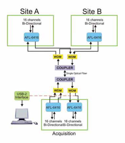 AFL-6400 可配(pei)寘(zhi)爲(wèi)遠(yuǎn)(yuan)程數(shù)據(jù)採(cǎi)(cai)集係(xi)統(tǒng),在(zai) PC 站點(diǎn)上使用(yong) USB2 接口,在(zai)遠(yuǎn)(yuan)程(cheng)站點(diǎn)(dian)上(shang)使用(yong) AFL-6400。兩箇(ge)站點(diǎn)(dian)之間的(de)距離可(ke)能(neng)長(zhǎng)達(dá) 50 公裏(li)。
